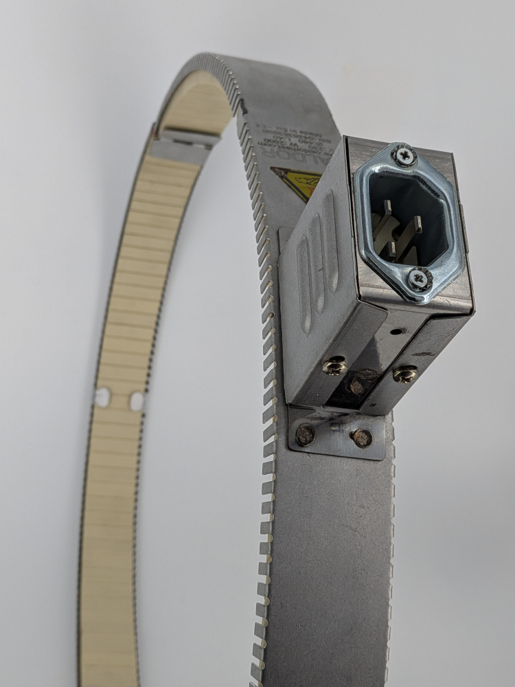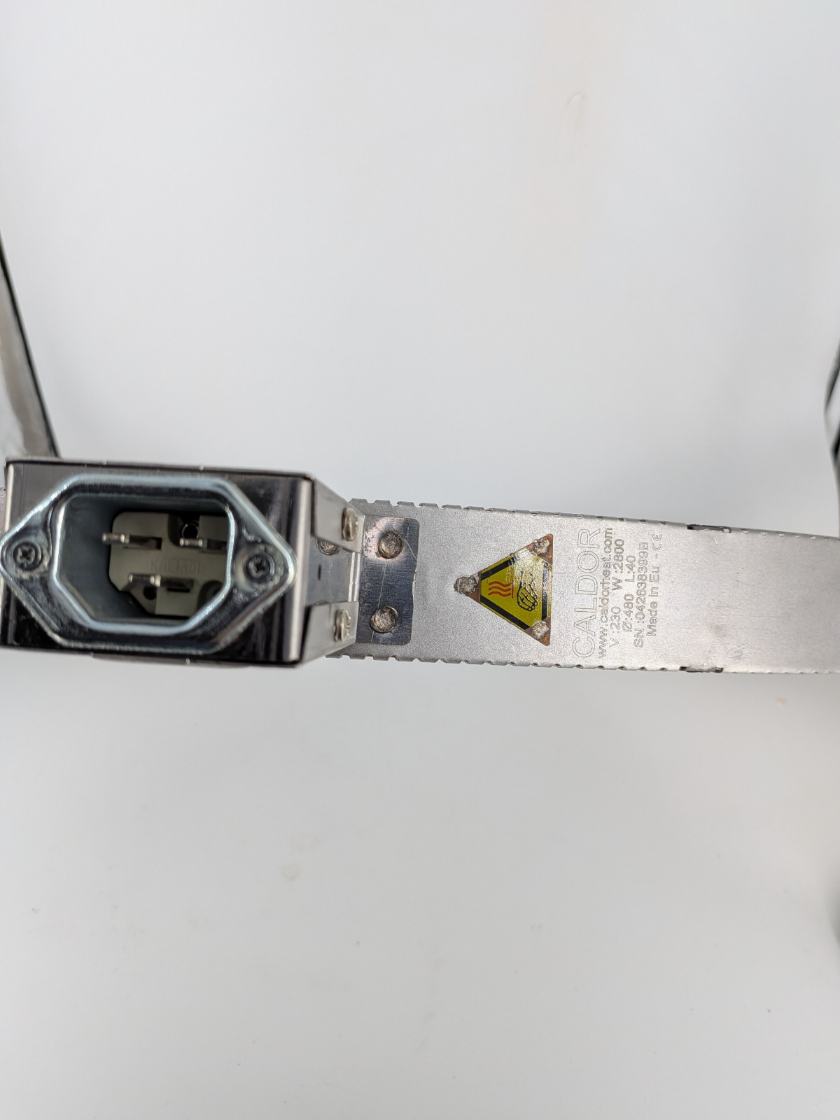 Ceramic band heater with dimensions 480 x 40 mm, rated at 230V and 2800W, equipped with a 3 pin socket for quick connection.
