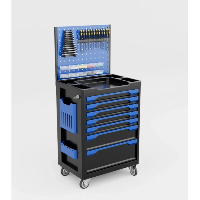 The 7-drawer system provides structured storage, while the panel allows quick access to frequently used tools.